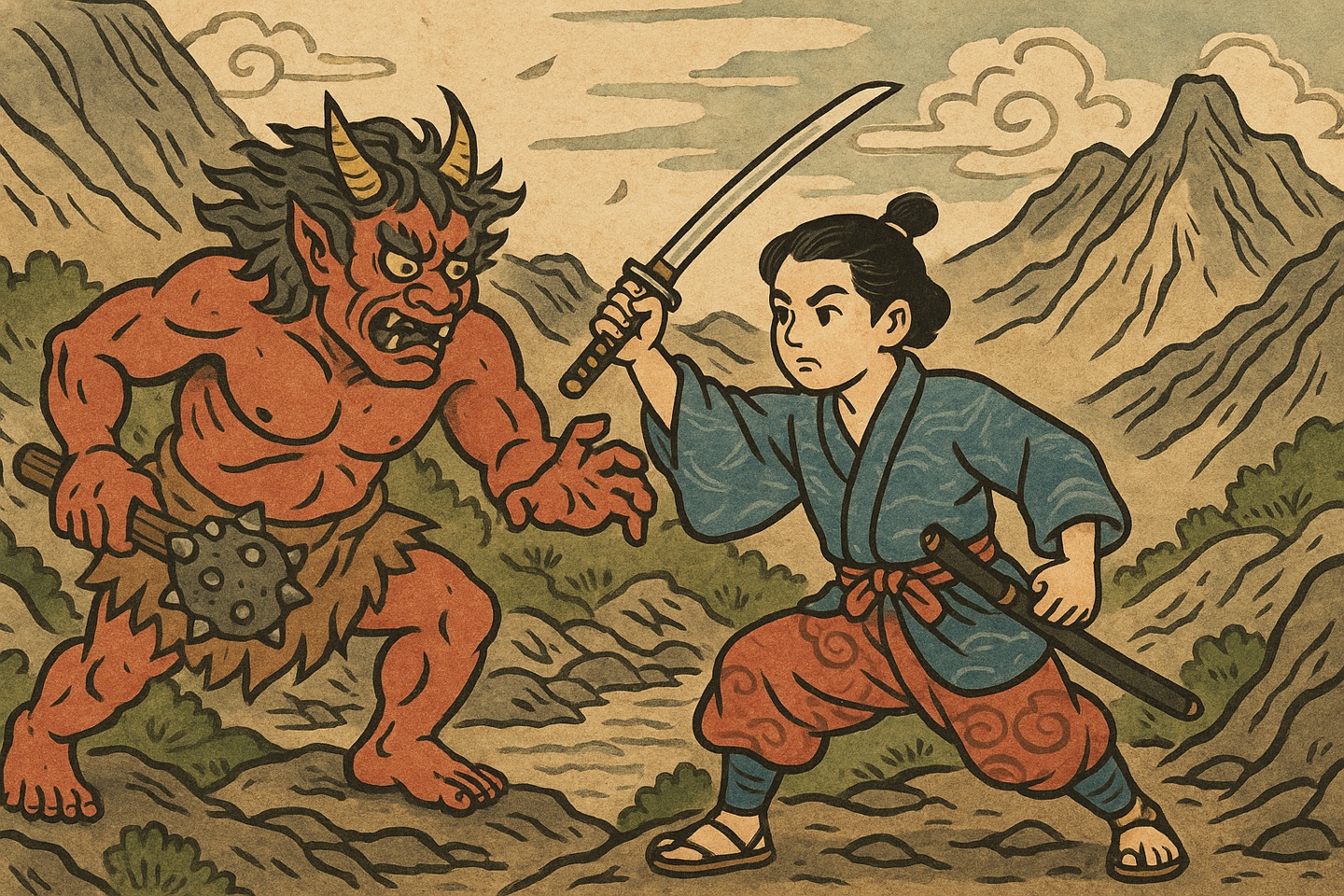 산속에서 요괴와 싸우는 모습, 숯검을 든 소년, 혹은 다로 축제의 풍경은 교육 자료나 콘텐츠 활용에도 적합합니다.